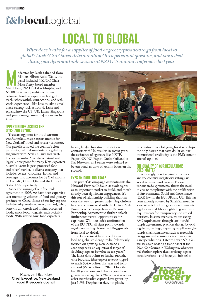 What does it take for a supplier of food or grocery products to go from local to global? Luck? Grit? Sheer determination? It’s a perennial question, and one asked during our dynamic trade session at NZFGC’s annual conference last year. Moderated by Sarah Salmond from Minters Ellison Rudd Watts, the panel included NZFGC Chair Mike Pretty, board member Matt Donn, NZTE’s Glen Murphy, and NZIBF’s Stephen Jacobi – all to say, between these five experts we had global reach, wherewithal, connections, and real-world experience – like how to take a small snack startup such as