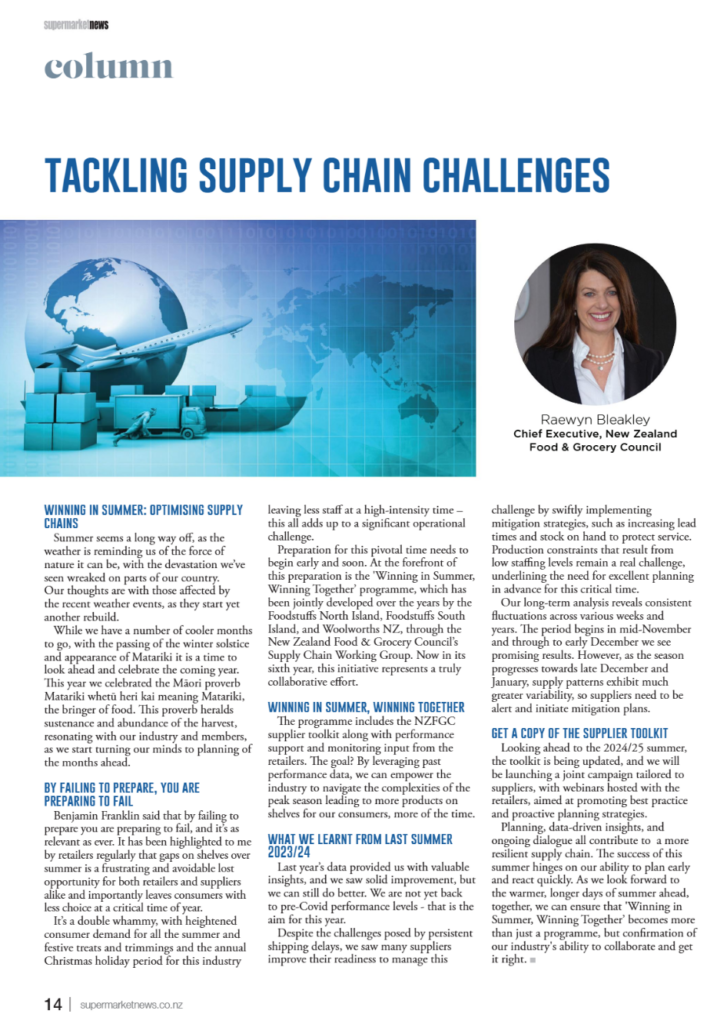 Preparation for this pivotal time needs to begin early and soon. At the forefront of this preparation is the 'Winning in Summer, Winning Together’ programme, which has been jointly developed over the years by the Foodstuffs North Island, Foodstuffs South Island, and Woolworths NZ, through the New Zealand Food & Grocery Council’s Supply Chain Working Group. Now in its sixth year, this initiative represents a truly collaborative effort.